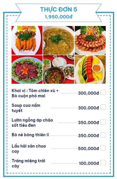 Giá trên mỗi bộ thực đơn đãi tiệc đã bao gồm bàn ghế, dụng cụ ăn uống, nhân viên phục vụ và phí vận chuyển (áp dụng khi quý khách đặt từ 4 bàn trở lên và trong nội thành thành phố Hồ Chí Minh). Nếu quý khách đặt dưới 4 bàn, Naifood vẫn sẽ cung cấp trọn gói đầy đủ dụng cụ ăn uống, bàn ghế, nhân viên phục vụ, nhưng Naifood sẽ phụ thu từ 300.000đ – 500.000đ tiền vận chuyển 2 chiều, tùy vào từng khu vực bạn muốn tổ chức tiệc.